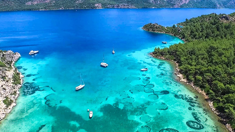 Opposite the southern shore of the Gulf of Gokova are four islands that include Kufre bay. Kufre is natural harbor and is surrounded by the Gulluk forest woodlands. This is a perfect place to either anchor in a small cove or in between islands, and enjoy some water sports, relaxation, and swimming. This is a popular destination for yachts, so you will also enjoy company too.