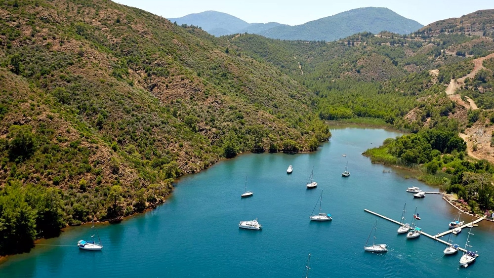 Next stop of your private gulet charter Turkey is Sarsala Bay. Yachtsmen love Sarsala Bay since it is a natural bay providing great swimming opportunities as well as a good place for overnight anchoring. The bay includes a pontoon that leads to a restaurant, and the inland scenery is delightful. There is a valley that leads inland through a dense forest of trees. The beach itself is stony, so come prepared.